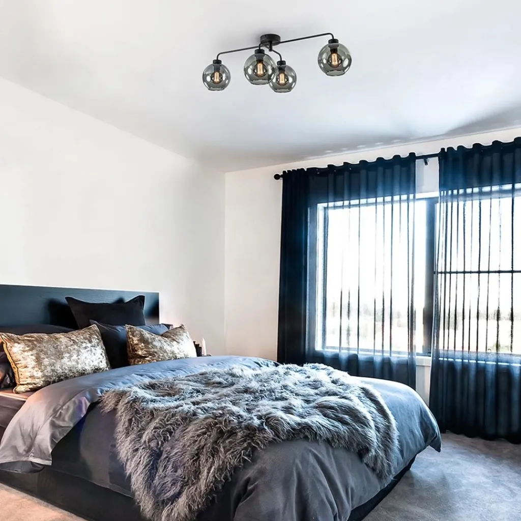 Perfect voor een slaapkamer, grote hal of de woonkamer. De 4-lichts plafondlamp heeft een mat zwart metalen armatuur welke is voorzien van 4 smoke glazen bollen. De bollen hebben een doorsnede van 18 cm en geven door het donkere glas een chique luxe uitstraling. De twee armen van het armatuur staan dwars op elkaar waardoor de lamp een ovale vorm krijgt. De kleine arm is te verstellen door deze te draaien. De 4-lichts plafondlamp met smoke glazen bollen wordt geleverd zonder lichtbron en is dimbaar middels een externe dimmer (exclusief).