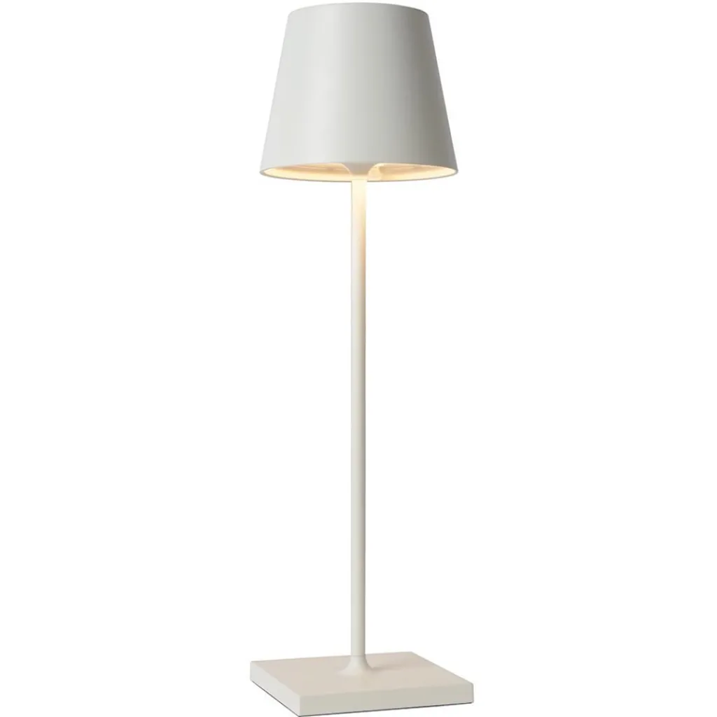Dit is misschien wel de meest ideale tafellamp. De lamp is draadloos en voorzien van een batterij en LED verlichting. De witte tafellamp is gemaakt van aluminium en zelfs IP54 goedgekeurd waardoor de lamp ook geschikt is voor buiten, leuk op het balkon of in de tuin op tafel. De kap is voorzien van een up- en downlight waarbij een touchdimmer in het uplight is verwerkt. Het licht kleurt rood zodra de batterij bijna leeg is en de lamp wordt gemakkelijk weer opgeladen met de meegeleverde kabel. Geen zorgen dus om het vinden van een stopcontact voor deze lamp, zet hem neer waar u wilt en geniet van de sfeervolle verlichting.