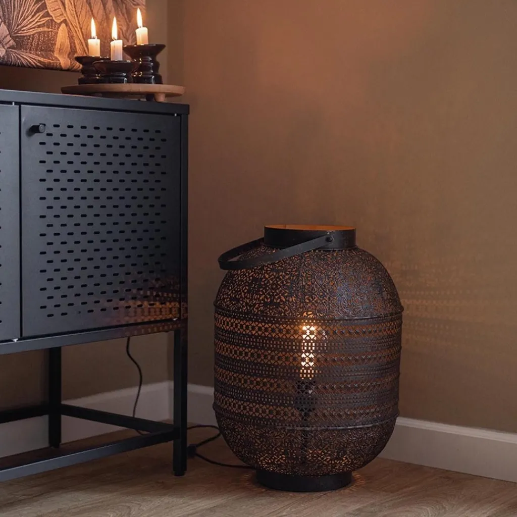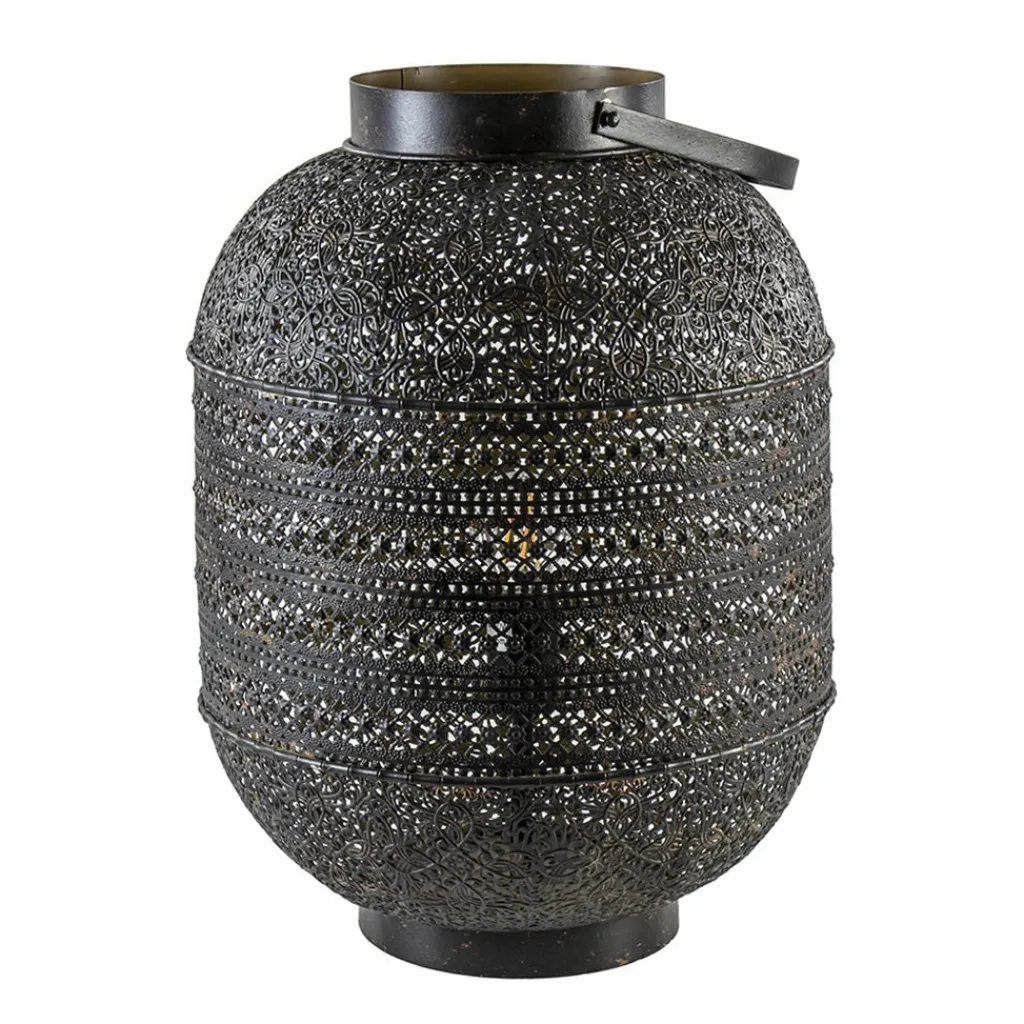 Met deze grote tafellamp creëert u al gauw een Oosterse sfeer in huis. De ronde lantaarn tafellamp is volledig van metaal en voorzien van een decoratief dessin. Het dessin geeft de tafellamp echt die Oosterse uitstraling en zorgt ook voor een mooi effect wanneer de lamp wordt ingeschakeld. De grote lantaarn is uitgevoerd in het donker bruin en voorzien van een antieke afwerking wat de lamp nog meer karakter geeft. Door het formaat past de lamp mooi op een dressoir, maar ook op de grond naast de bank zorgt deze sfeervolle lantaarn voor een leuk effect. Van binnen is de lamp goudkleurig wat zorgt voor een extra warme verlichting en aan de buitenzijde is de lantaarn voorzien van een hengsel wat de lamp helemaal afmaakt. De donker bruine Oosterse tafellamp is voorzien van een zwart snoer van 180 cm, met een knipschakelaar op 35 cm van de lamp, en wordt geleverd zonder lichtbron (E27).
