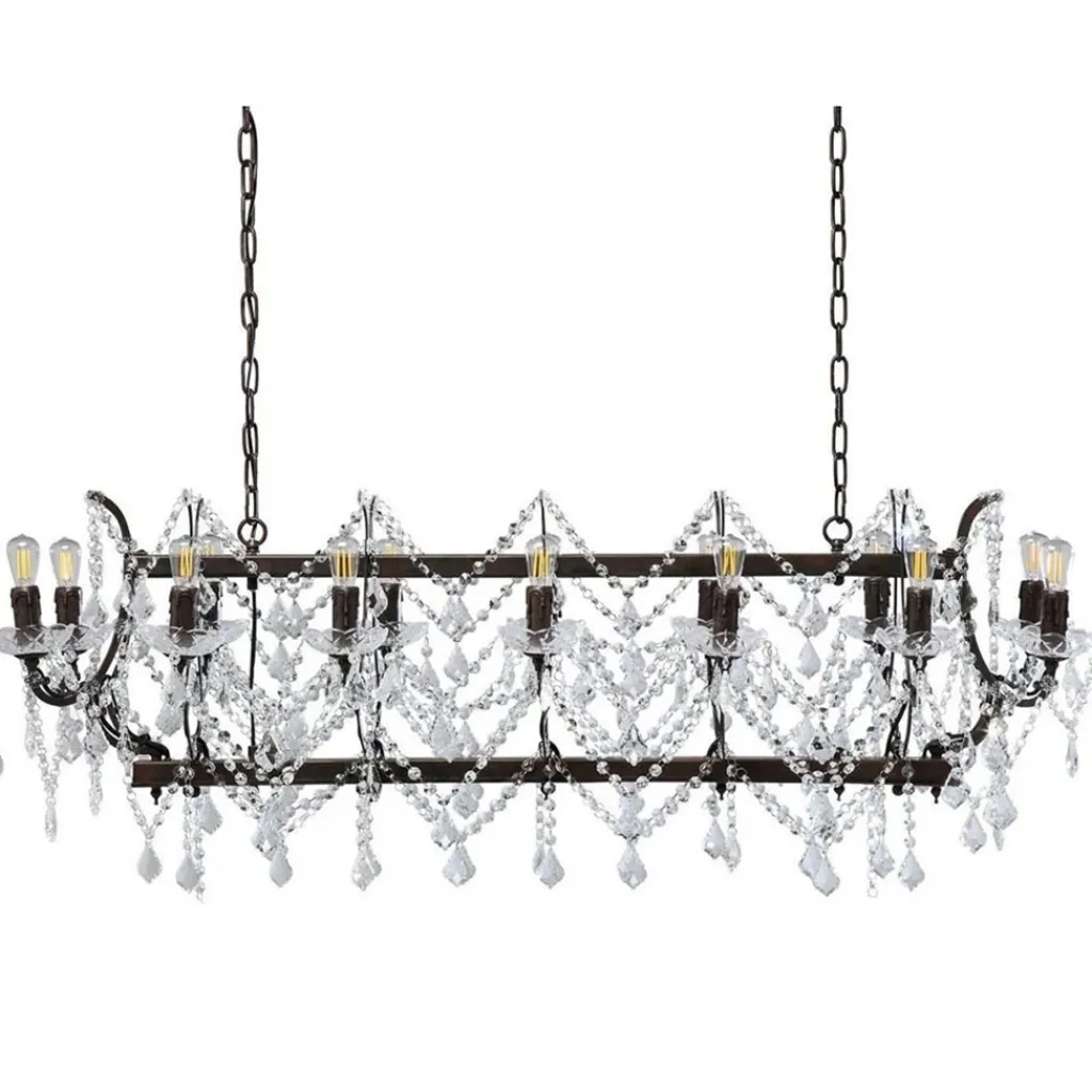 Een mooie eye-catcher voor boven een eettafel. Deze klassieke hanglamp bestaat uit een metalen frame waar 14 lichtpunten op zijn verwerkt. De lamp doet denken aan een kroonluchter en is ook op dezelfde wijze versiert met kristalglas. De kristallen pegels zijn verbonden met kleine ringetjes die samen een ketting vormen. De lichtpunten hebben een koper, roest-achtige kleur en zijn afgewerkt met glazen schoteltjes. De grote hanglamp hangt aan twee stevige kettingen die naar wens zijn in te korten. De klassieke lamp wordt met een kleine plafondbalk opgehangen in dezelfde kleur als de ketting en het armatuur. De hanglamp is een mooie nieuwe vertaling van de klassieke kroonluchter.