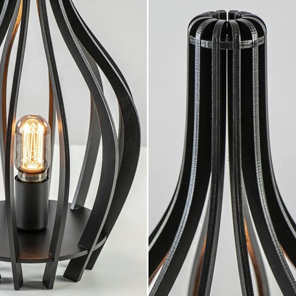 Een leuke tafellamp met een uniek design. De kegelvormige tafellamp bestaat uit houten lamellen die worden ondersteund door een grote ring aan de onderzijde en een kleine ring aan de bovenzijde. In de onderste ring zit ook de E27 fitting verwerkt. Het hout heeft een wat grovere afwerking waardoor de tekening in het hout nog steeds zichtbaar is. De kegel vormige tafellamp wordt geleverd zonder lichtbron en is voorzien van een zwart snoer van 180 cm, met een knipschakelaar op 60 cm in het snoer.