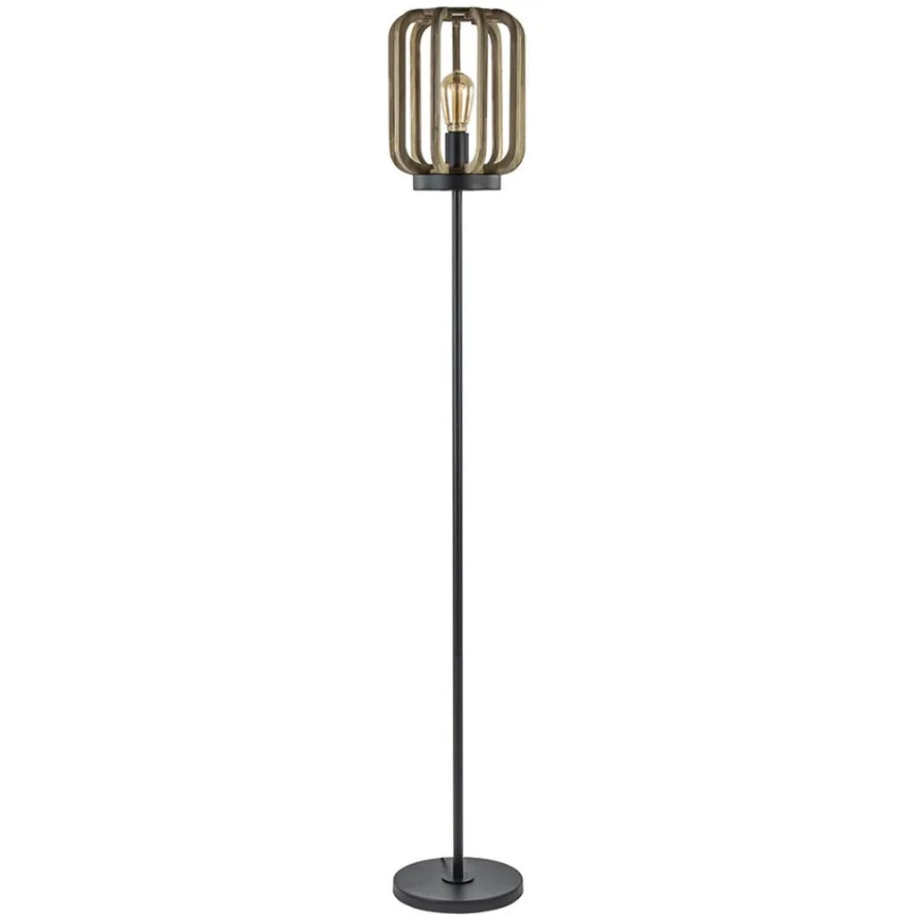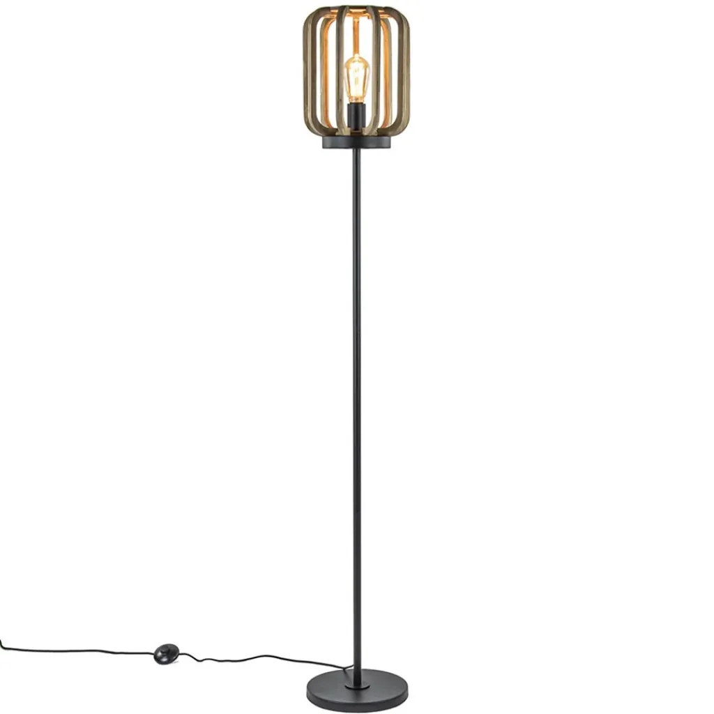 Straluma Mat zwarte vloerlamp met ruwe houten kap> Kooilampen|Woonkamerlampen