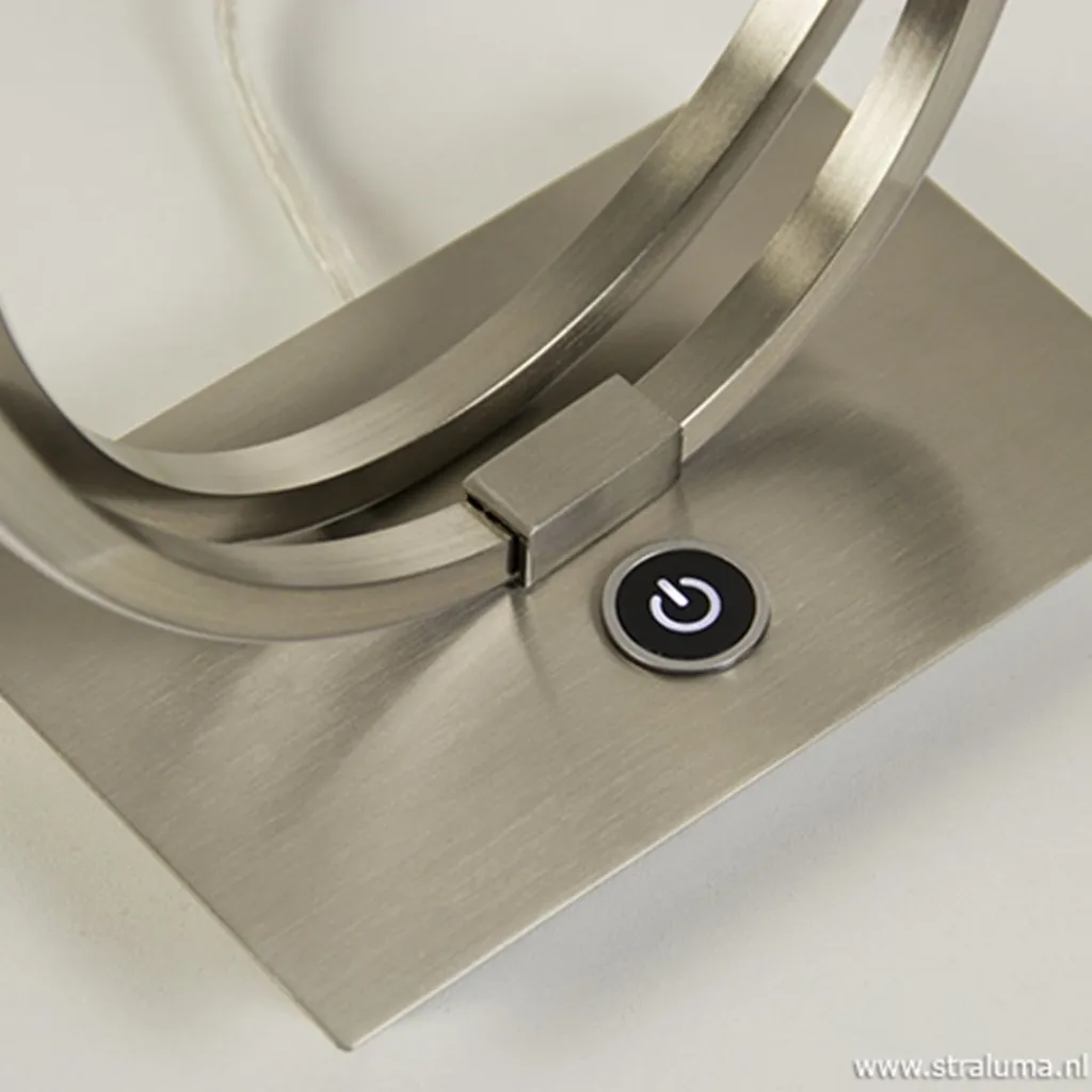 Een moderne LED tafellamp met touchdimmer. De metalen tafellamp in kleur nikkel is op de voet voorzien van een touchknop die drie dimstanden kent. De bogen van de lamp zijn volledig voorzien van LED strips wat een mooie sfeervolle verlichting geeft en ook nog eens energiezuinig is. Een ideale sfeermaker met modern design!
