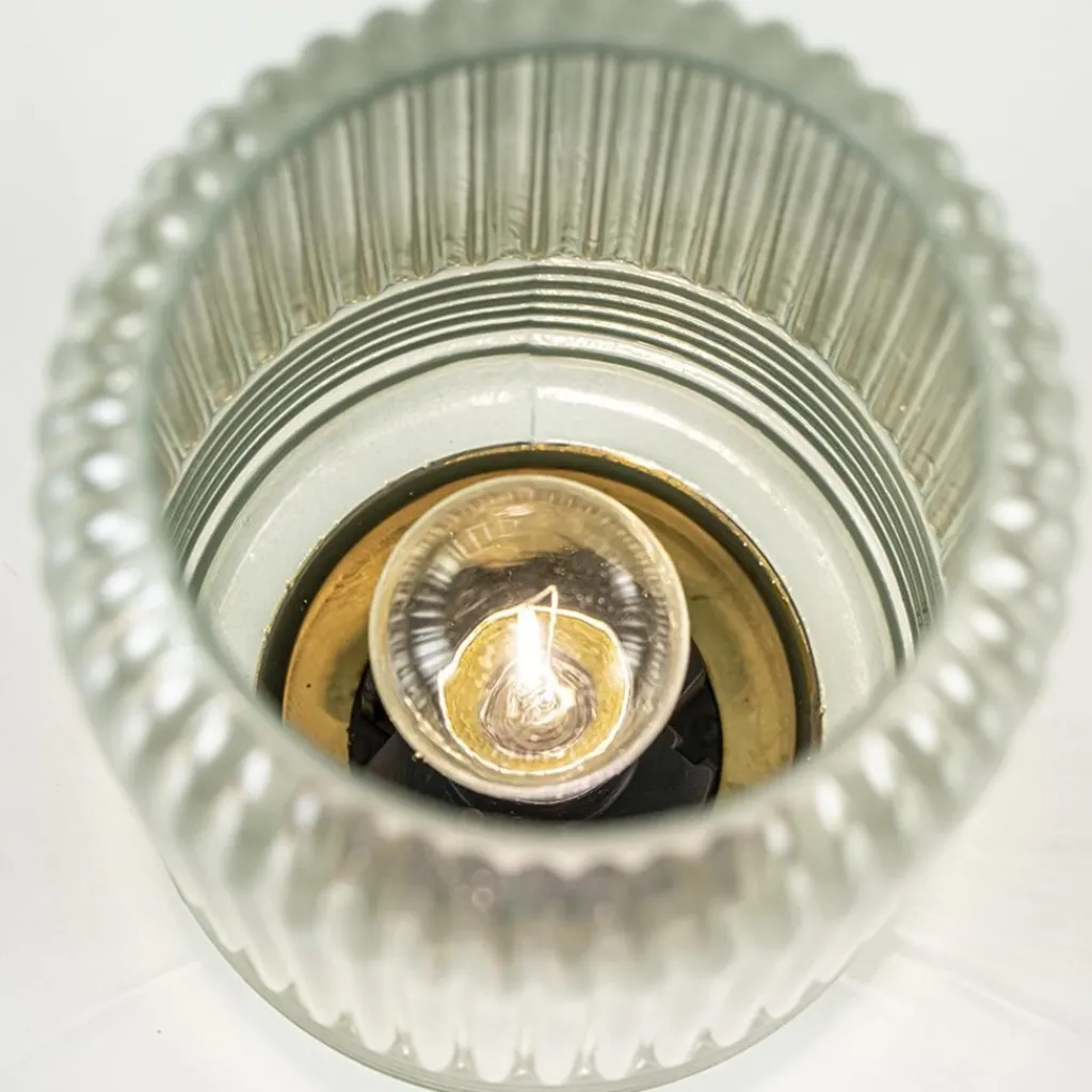 Dit tafellampje van glas met een goud/messing voetje is één en al sfeer. Het half-transparante grijs-groene ribbel glas geeft het licht een prachtig effect. De ribbels in het glas lopen aan de onderkant horizontaal, daar boven zijn de ribbels verticaal. Dit geeft deze eenvoudig ogende tafellamp een bijzonder tintje. Fijn is ook dat het lampje werkt op 2 AAA-batterijen (excl), hierdoor is het echt overal te plaatsen. van de woonkamer tot de slaapkamer of de studentenkamer! Mooi in een romantisch, landelijk of botanisch interieur.