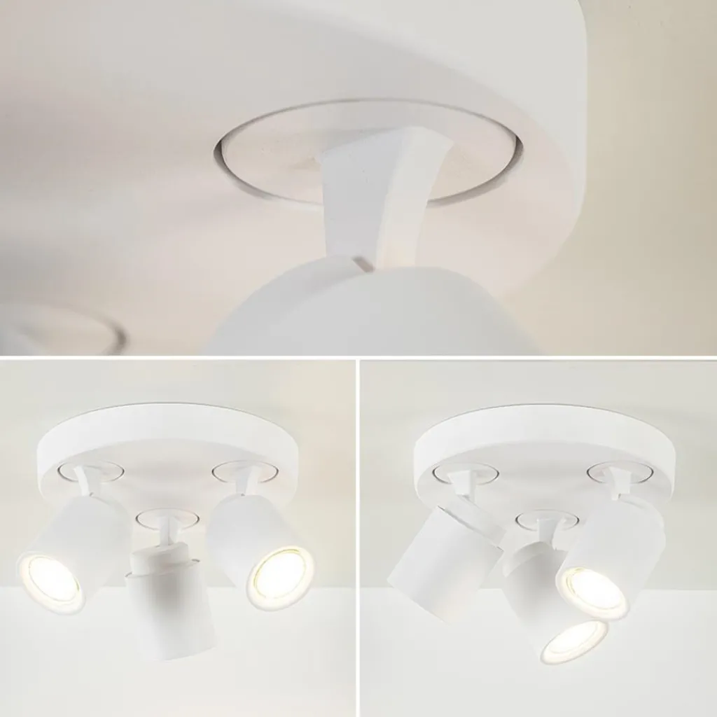 Op zoek naar een elegante plafondlamp? Dan is deze 3-lichts opbouwspot rond echt iets voor u! De witte uitvoering zorgt voor zowel een landelijke als Scandinavische toevoeging aan uw interieur. De ronde opbouwspot is verstelbaar, zo kunnen de kapjes gekanteld en gedraaid worden, zodat u uw eigen draai aan deze spots kan geven. Ideaal voor een hal of slaapkamer. De witte 3-lichts opbouwspot wordt geleverd zonder lichtbron en is dimbaar met een externe dimmer (exclusief). De lichtbron kan worden geplaatst door de volledige kap van de spot los te draaien.