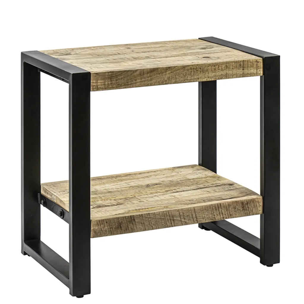 Simpele bijzettafel met een stoer uiterlijk. De bijzettafel bestaat uit 2 lagen. Beide hebben een mango houten blad met een mat zwart metalen frame. Het hout heeft een naturel finish. Het tafeltje kan ook dienen als nachtkastje.