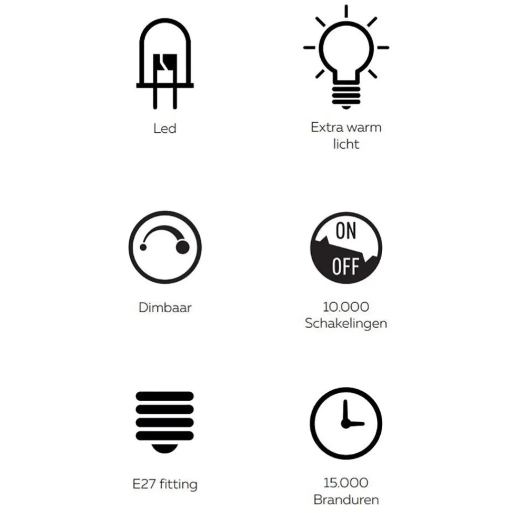 Deze decoratieve bol zorgt voor een fijne sfeer en is ook nog eens mooi om te zien. De grote lichtbron heeft reliëf in het glas wat de lamp net even wat meer trendy maakt. De globe lichtbron heeft een doorsnede van 20 cm en geeft met 2000 Kelvin een warm witte verlichting.