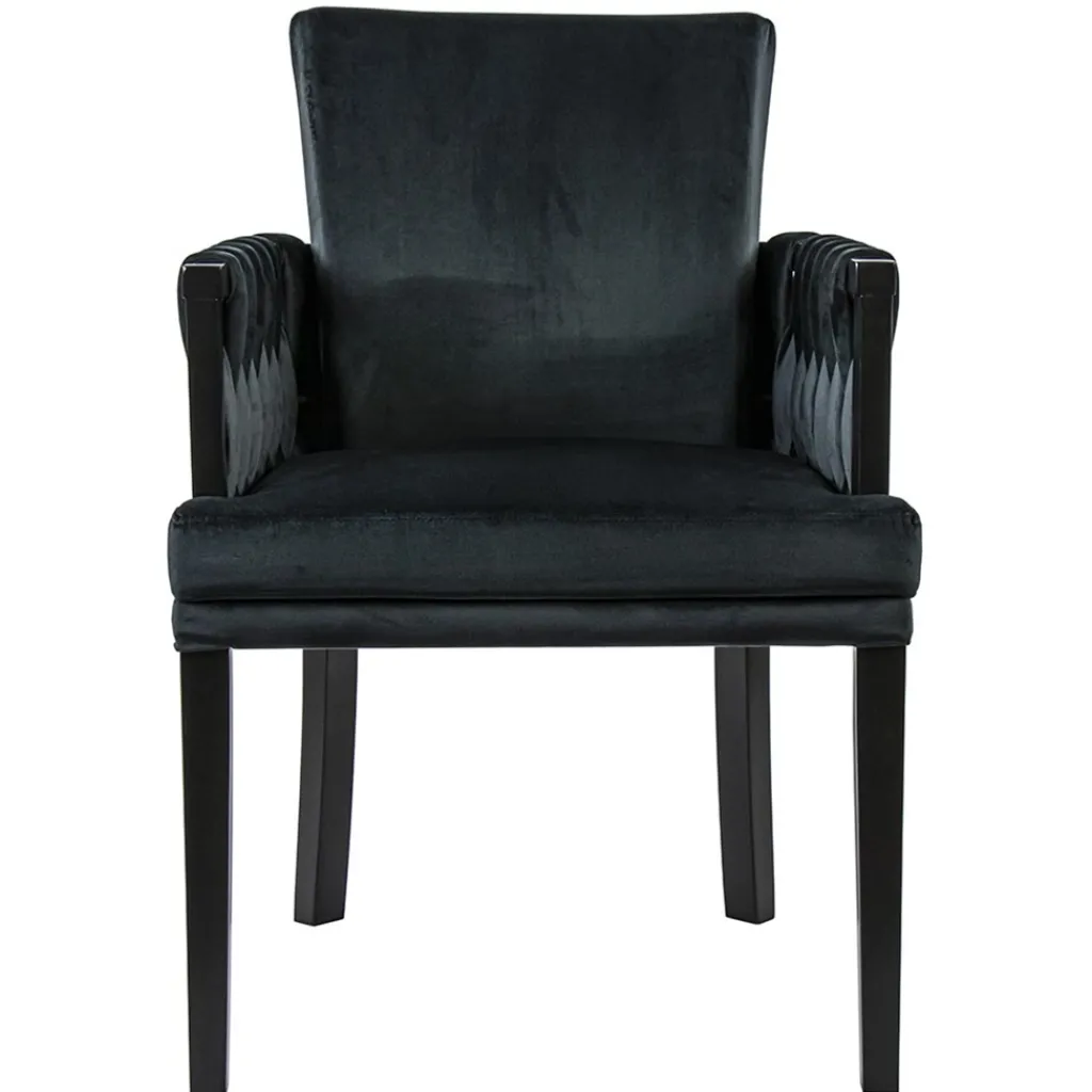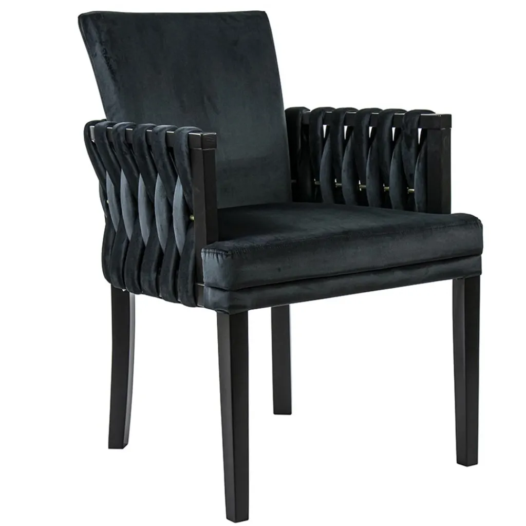 Met deze chique eetkamerstoel maakt u de eetkamer helemaal af. De luxe stoel heeft een hoogwaardig zitcomfort en is voorzien van mooie details. Zo heeft de armstoel een sierlijke leuning die verder doorloopt in de rug. In deze leuning is een gouden stang geplaatst waar de stof mooie doorheen is gevlochten. Dit geeft de stoel een luxe uitstraling wat wordt versterkt door de velourse stof. De poten zijn van hout en uitgevoerd in het zwart. Een verrijking voor de eetkamer en een genot om op te zitten.