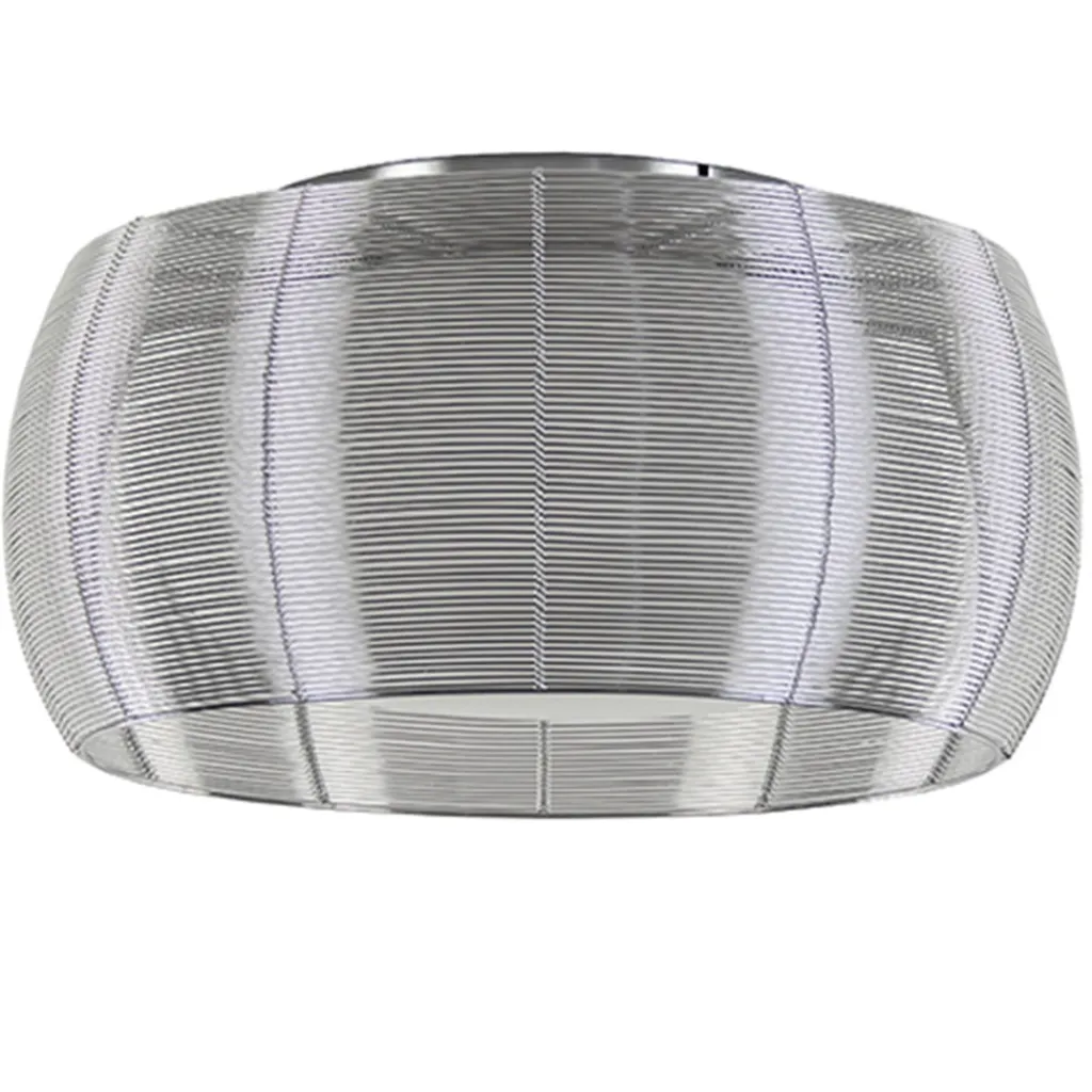 Op zoek naar een plafondlamp-plafonnière die mag opvallen? Dan is dit wat u zoekt. De grote ronde kap van 50 cm is gemaakt van een zilveren frame waartussen zilveren ijzerdraden zijn gevlochten. Dit geeft de kap een draadlamp effect. Voordeel van deze lamp is dat deze van binnen is afgewerkt met een mat glazen kap, dit zorgt ervoor dat u niet direct in de lichtbron kijkt en het matte glas zorgt voor een warme en sfeervolle verlichting. De grote plafondlamp wordt met een chromen plafondplaat opgehangen. Door z’n grootte past de lamp mooi in een slaap- of woonkamer.