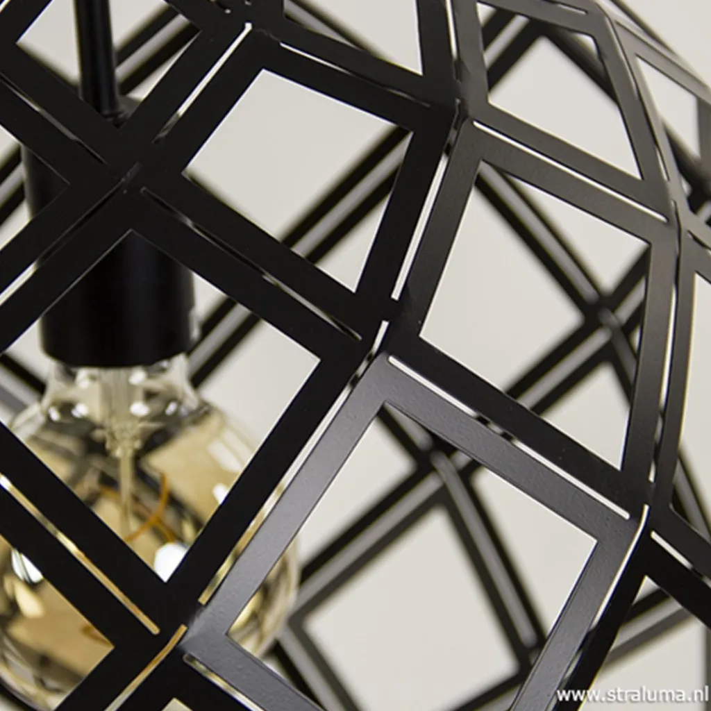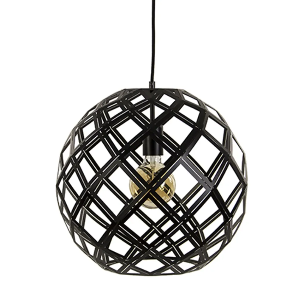 Deze metalen hanglamp geeft een Scandinavisch tintje aan het interieur. De mat zwarte hanglamp heeft door de open structuur een gevlochten effect wat de kap een speelse uitstraling geeft en een mooie lichtverdeling geeft. De ronde kap heeft een rechte onderkant met grote opening waardoor het makkelijk is om de lichtbron te vervangen. De bovenzijde van de kap is dicht en verloopt in het zwarte strijkijzersnoer.