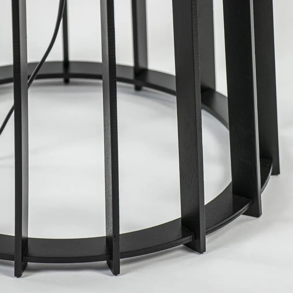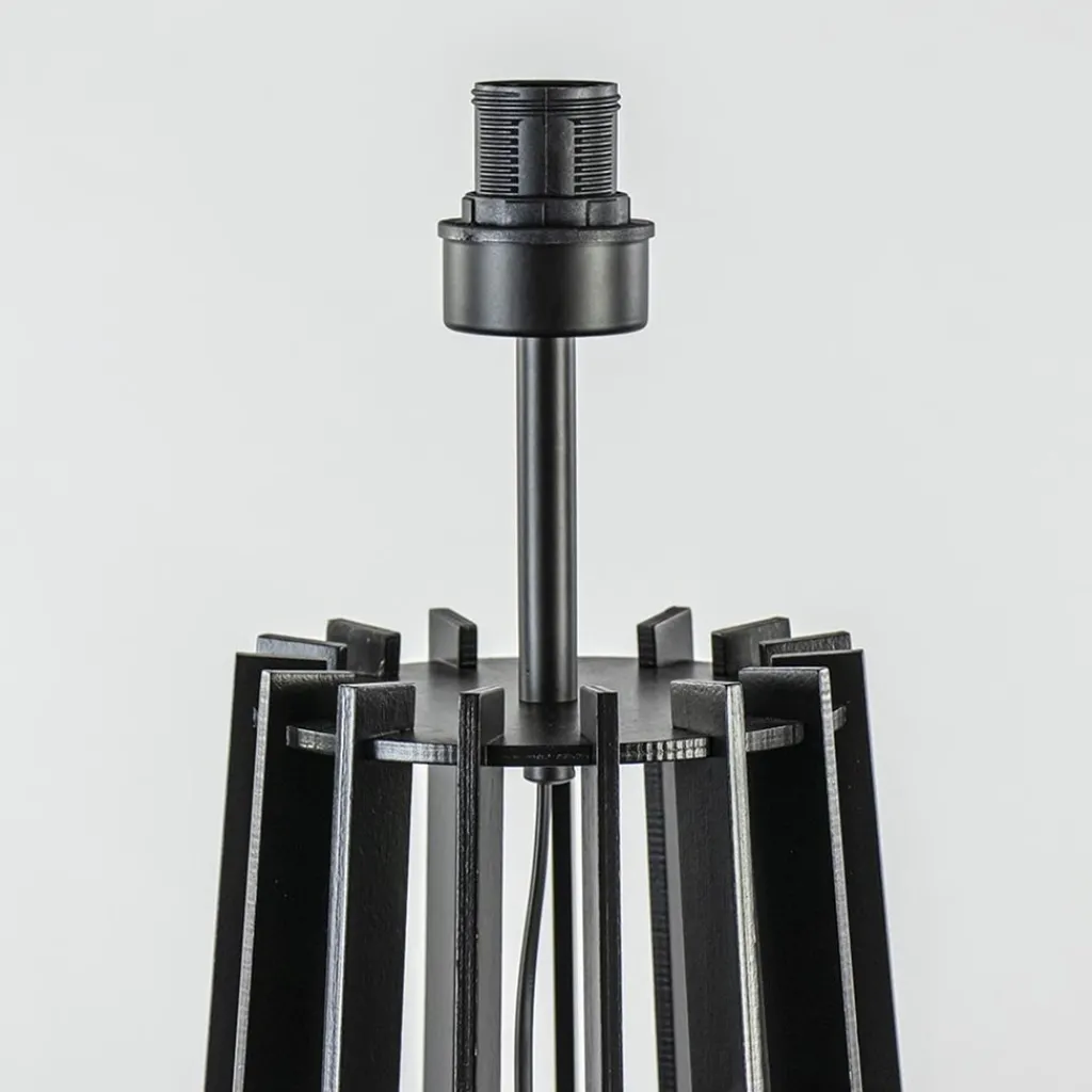 Een stijlvolle lampvoet die prima geschikt is voor diverse woonstijlen. De vloerlamp wordt geleverd exclusief kap zodat u deze verder naar wens kunt afmaken. Doordat de lamp is uitgevoerd in het mat zwart is er veel te combineren. De lampvoet is gemaakt van hout en loopt taps toe van onder naar boven. De losse houten lamellen worden ondersteund door drie houten ringen waarbij in de bovenste ring een fitting is bevestigd. Hier plaatst u gemakkelijk de kap op door de fittingring los te draaien. De zwarte houten vloerlamp heeft veel snoer binnenin de voet, maar heeft nog een losse lengte van 200 cm, en een schakelaar op 50 cm van de lamp.