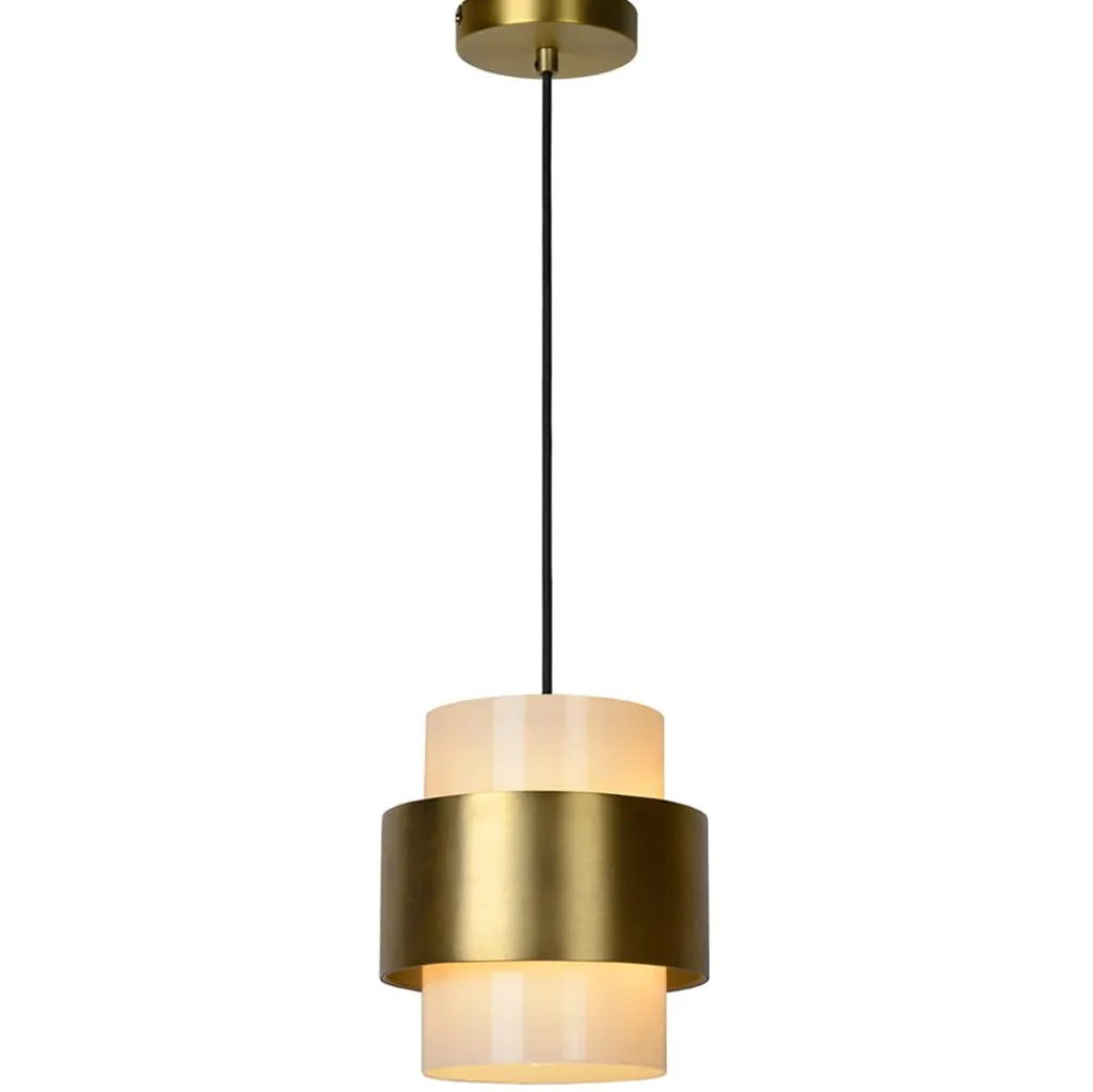 Klassiek met een retro tintje. Deze hanglamp is een verrijking voor het interieur. De hanglamp bestaat uit een cilinder vormige opaal glazen kap met daar omheen een metalen mat gouden ring. Het opale glas zorgt voor sfeervol diffuus licht en tevens dat u niet in de lichtbron kunt kijken. De ronde kap hangt aan een zwart stof omwonden snoer welke naar wens in hoogte is te verstellen. De hanglamp past mooi boven een ronde eettafel, salontafel of als extra sfeerlicht in de woonkamer. De klassieke hanglamp is dimbaar middels een externe dimmer (exclusief).