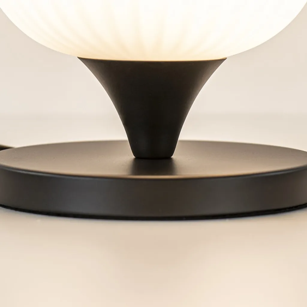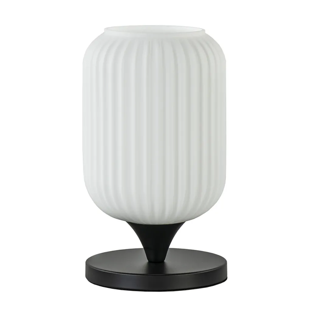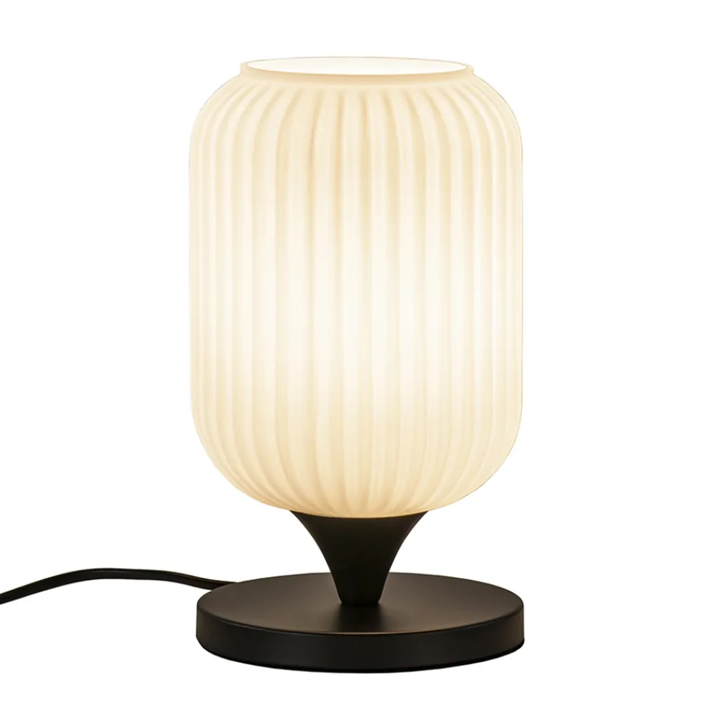 Deze tafellamp is een leuke toevoeging aan het interieur. Door het lage voetje kan de tafellamp op diverse plekken worden toegepast als het dressoir, in een kast of zelfs op het nachtkastje. Het voetje is gemaakt van metaal en uitgevoerd in het mat zwart. Deze ondersteund de mat witte glazen kap met reliëf. Dit geeft de tafellamp een retro look die mooi matcht in diverse stijlen. De tafellamp is voorzien van een zwart snoer met een lengte van 180 cm en wordt geleverd exclusief lichtbron.