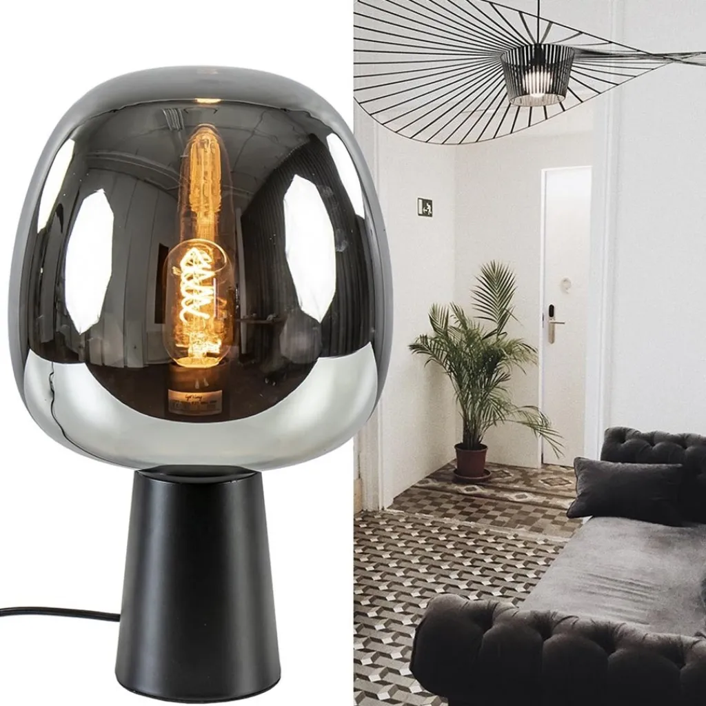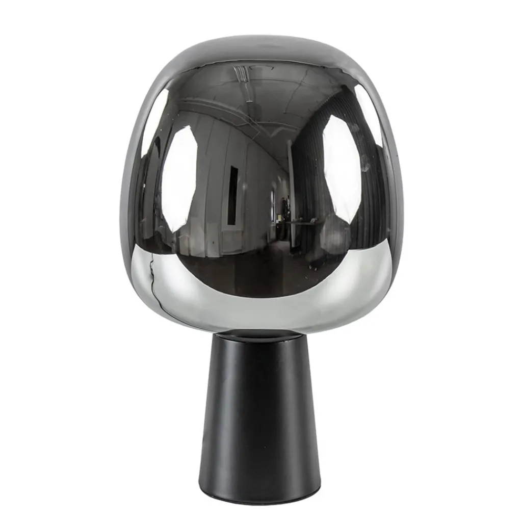 Een moderne tafellamp met een luxe uitstraling. Tafellamp Mayson bestaat uit een mat zwarte voet met daarop een smoke glazen kap. De ronde kap wordt vastgedraaid op de voet zodat het een stevig geheel vormt. Het smoke glas heeft een titanium look wat zorgt voor een spiegelend effect. Dit geeft de tafellamp een luxe uitstraling die wordt versterkt wanneer de lamp wordt ingeschakeld. De voet is voorzien van een zwart snoer van 150 cm, met een knipschakelaar op 55 cm. Tafellamp Mayson past mooi in een strak klassiek, modern of luxe interieur.