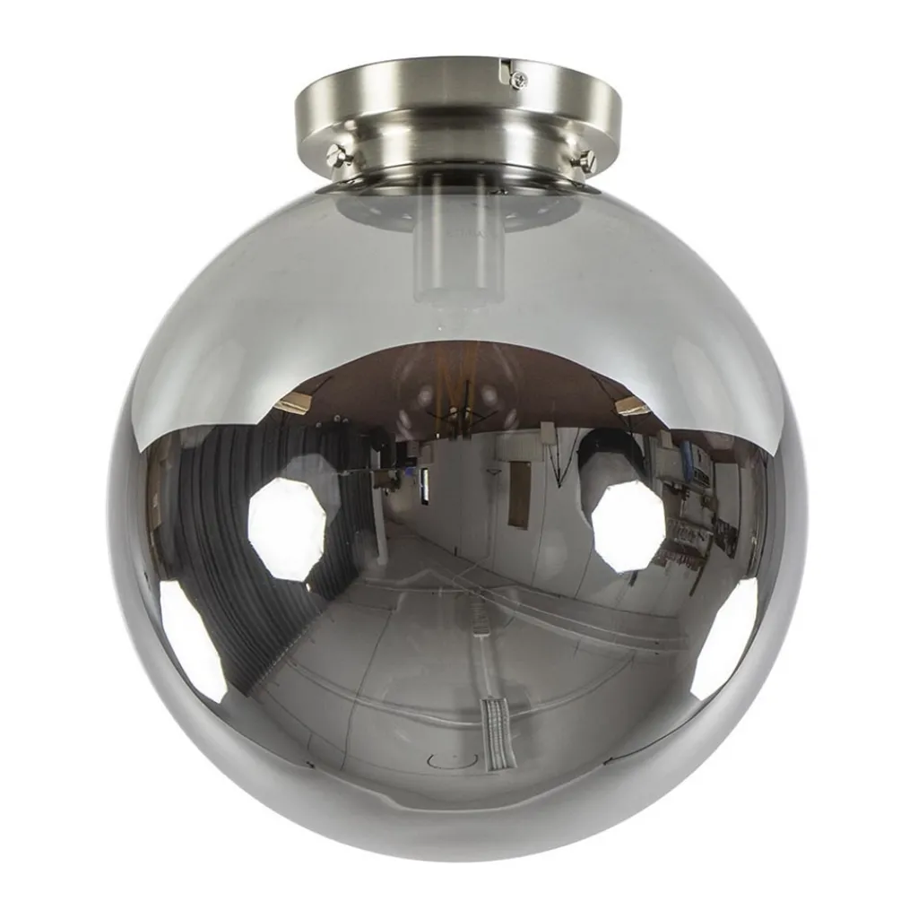 Ideaal voor in een hal of slaapkamer. Deze moderne plafondlamp met retro knipoog voldoet helemaal aan de trends van nu. Het smokey glas is helemaal on trend en is gemakkelijk toe te passen in diverse woonstijlen. Het spiegelende glas heeft een luxe uitstraling die zowel aan als uit opvalt. De glazen bol is snel los te maken van de nikkel bevestiging door de 3 schroeven los te maken.
