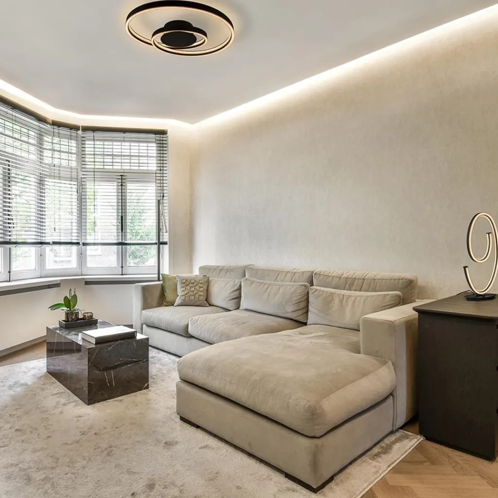 Een moderne plafondlamp met een strak design. De mat zwarte plafondlamp bestaat uit twee ringen die in elkaar overlopen. De plafondlamp heeft twee LED strips, één aan de binnenkant van de ringen en één aan de onderkant. Dit zorgt voor een mooie lichtverspreiding. De LED plafondlamp is geschikt voor een woonkamer, slaapkamer of de hal. Hij past perfect in de moderne woonstijl. De moderne plafondlamp is dimbaar met een geschikte LED dimmer (exclusief).