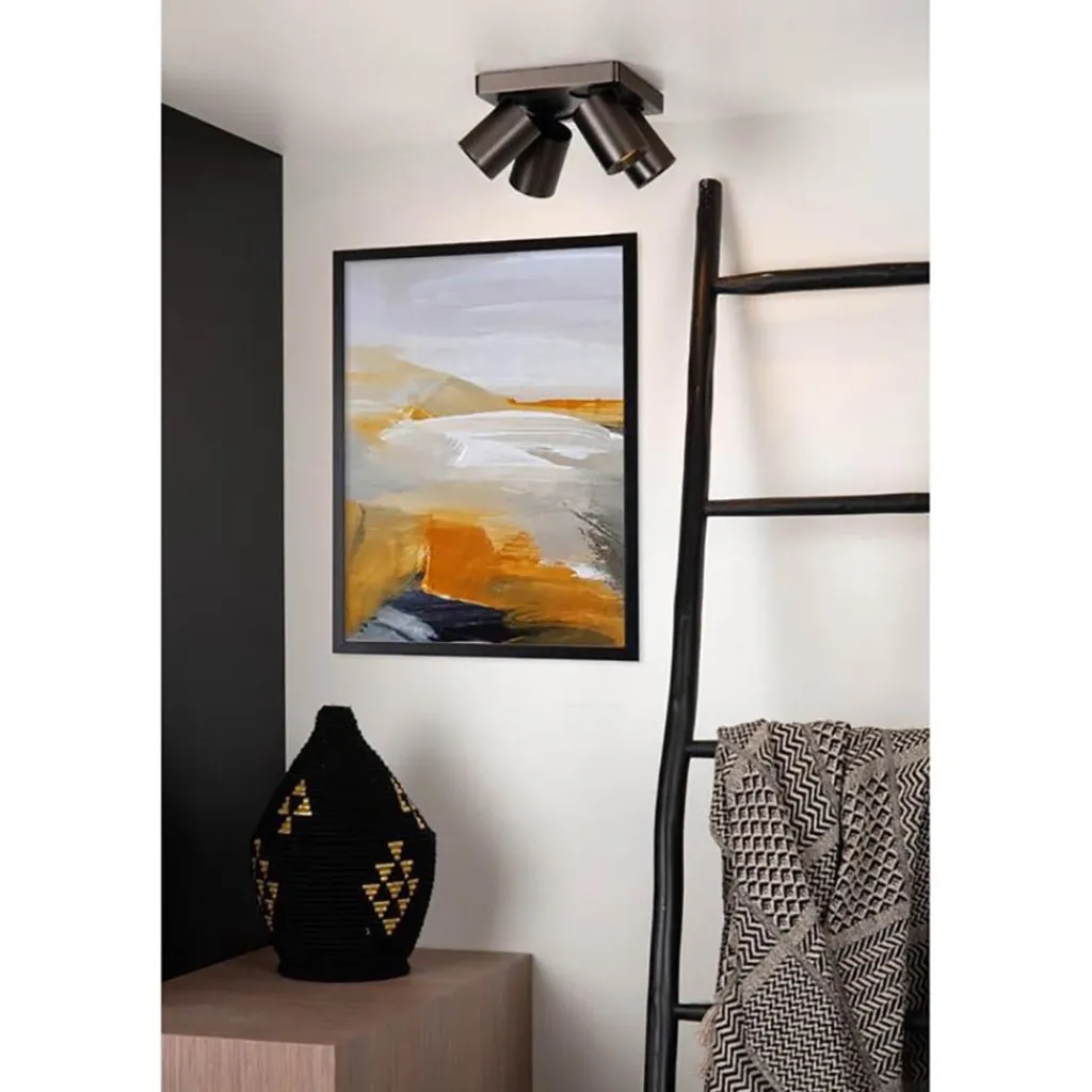 Deze moderne plafondspot is een ideale manier om een hal, slaapkamer of woonkamer uit te lichten. De opbouwspot is gemaakt van aluminium en uitgevoerd in het zwart staal. De cilinder vormige spots zijn draai- en kantelbaar zodat deze altijd naar de juiste richting kunnen schijnen. De vierkante 4-lichts plafondspot wordt geleverd inclusief LED lampen met dim to warm functie. Deze zijn te dimmen met een juiste dimmer.
