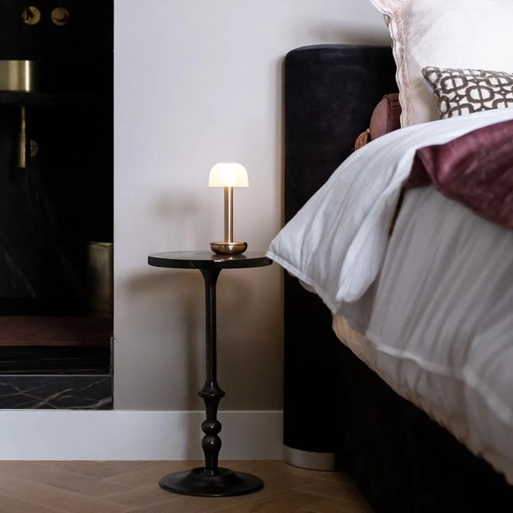 Een stijvolle tafellamp die u kunt plaatsen waar u wilt. Deze tafellamp is namelijk voorzien van een oplaadbare accu. Deze kan gemakkelijk worden opgeladen dmv de meegeleverde USB kabel of één van de verkrijgbare chargers (exclusief). De kleine tafellamp heeft een luxe uitstraling door het frosted glas dat is gecombineerd met het gouden voetje. Het tafellampje op batterij heeft een LED lichtbron en is dimbaar in 3 standen, candle, ambient en work. Door de knop onderop schakelt u gemakkelijk tussen de standen. Onderop ziet u ook snel hoe vol de accu nog is dmv de lampjes. De titanium tafellamp heeft een batterijduur van max 96 uur en wordt opgeladen binnen 4 tot 6 uur. De draadloze tafellamp is IP43 goedgekeurd zodat hij spatwater bestendig is. Ideaal wanneer u de lamp ook op uw balkon of tuin wilt gebruiken.