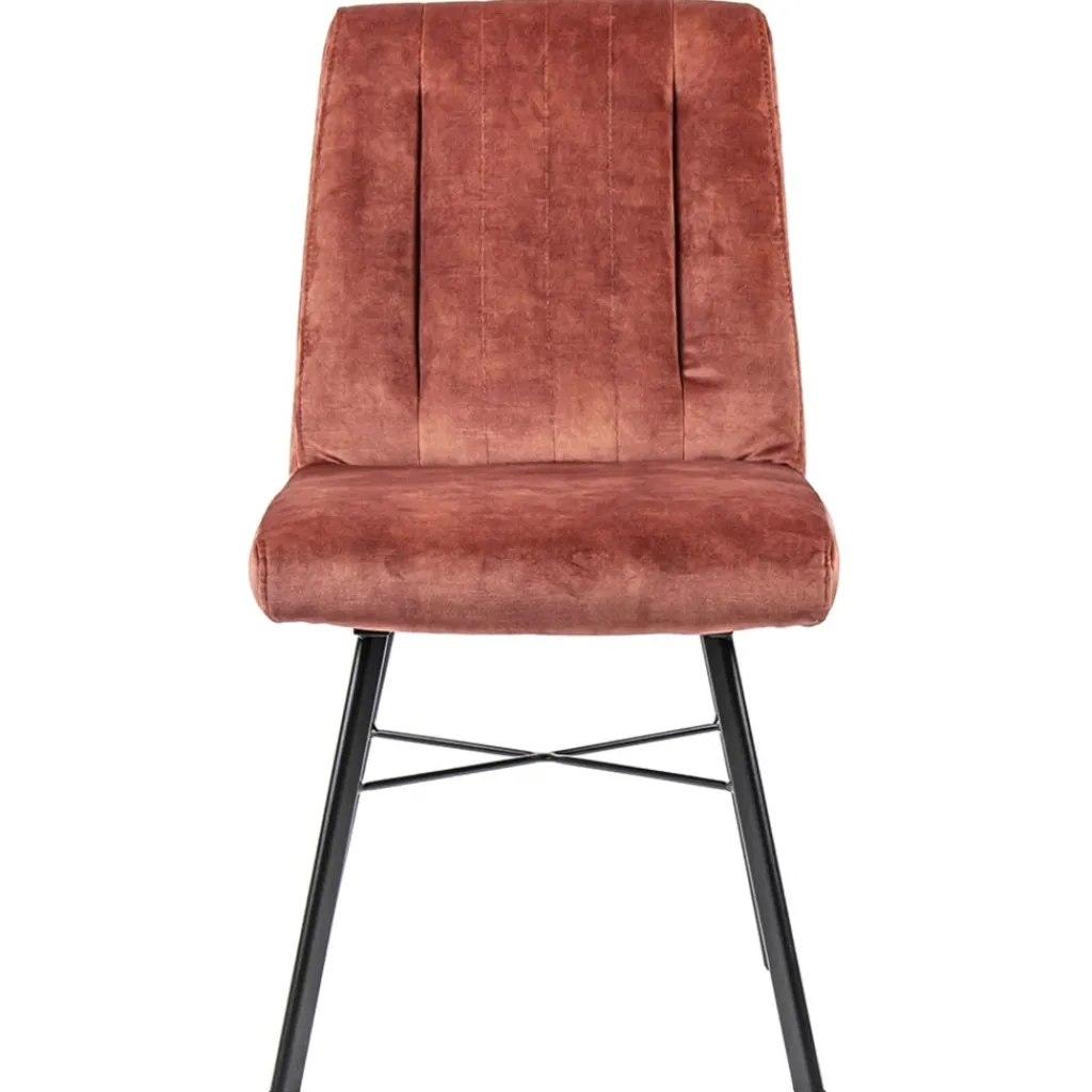 Een trendy stoel die prima geschikt is voor een landelijk of chique interieur. De stoel is voorzien van een velourse stof wat een luxe uitstraling geeft. De strak vormgegeven metalen poten maken de eetkamerstoel wat moderner en stoerder. De stoel is volledig ton sur ton waardoor stiksels niet opvallen en de zitting en leuning één geheel vormen. De rugleuning is voorzien van een aantal decoratieve stiksels die de stoel net even wat extra opleuken. Een fijne stoel met een hoog zitcomfort zodat tafelen en natafelen een waar genot wordt.